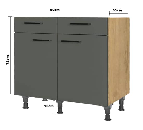 Meuble bas de cuisine Nobilia Easytouch avec deux tiroirs et deux portes, mesurant 90 cm de large, 78 cm de haut pour le caisson (hors pieds) et 60 cm de profondeur, avec des pieds réglables de 10 cm.